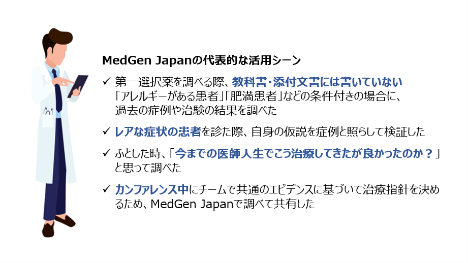 実際にMedGen Japanの代表的な活用シーンとしても下記のものが挙げられ、以前のキーワード検索などでは解決の難しかった複雑な課題の解決に利用をされていることが目立ちます。