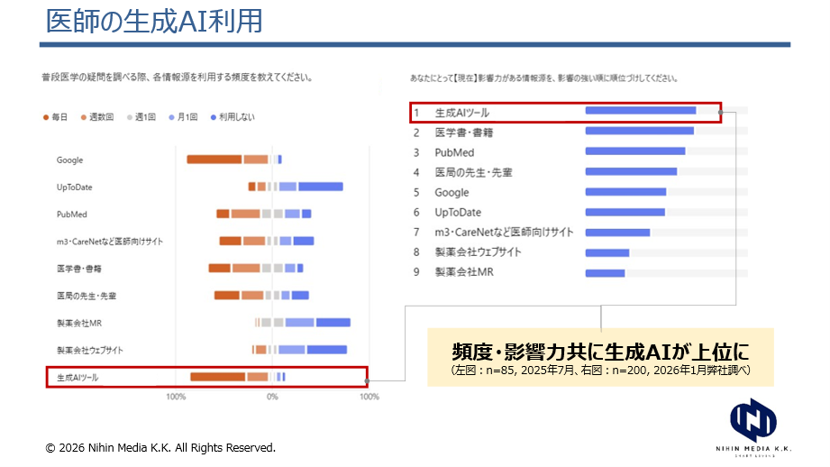 私たちは医師向けの臨床支援AI「MedGen Japan」を手掛け、2024年より医師の医療現場での生成AI利用実態を分析してきました。また、前職は製薬業界に特化したコンサルティングファームZS Associatesであり、その頃からAIを用いた医師の情報収集を、主に製薬企業の視点から追ってきました。