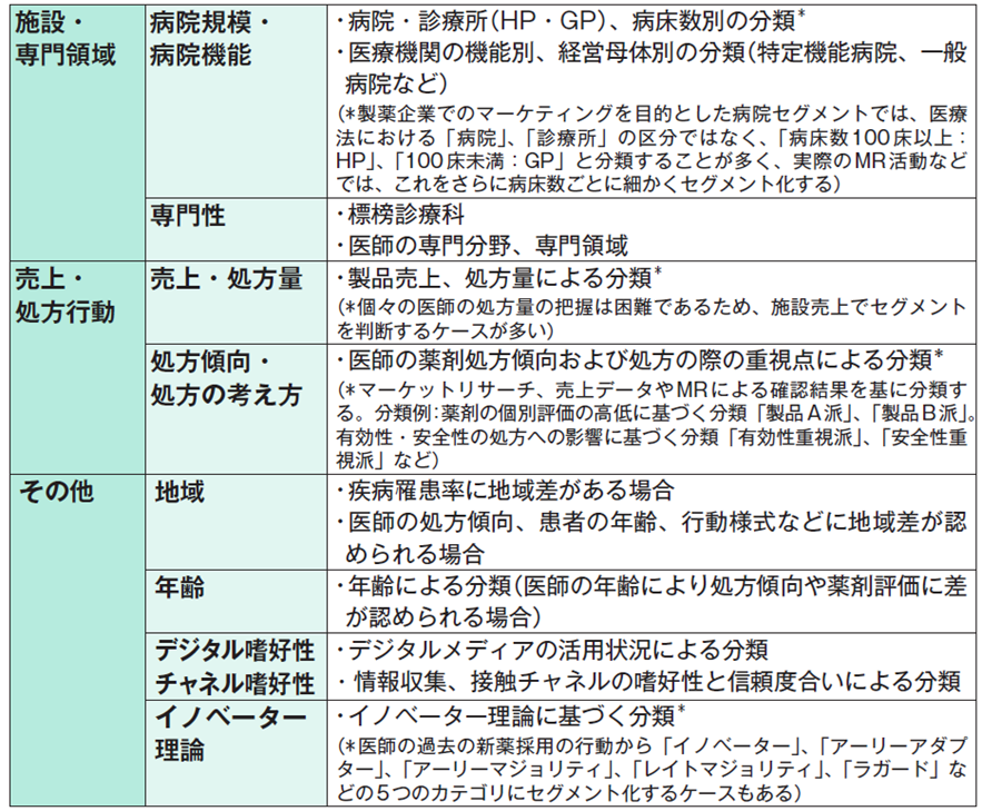 一般的なマーケティングでは、地理的変数(ジオグラフィック変数)、人口動態変数(デモグラフィック変数)、心理的変数(サイコグラフィック変数)、行動変数(ビヘイビアル変数)といった4つの切り口が使われます。ただし、医療用医薬品の場合、対象がすでに医師という専門職に限定されていることから、特に重要になるのは、施設・専門領域(人口動態変数)と売上・処方行動(行動変数)と言えます。