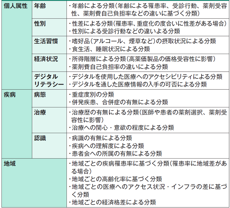 こちらも、医師と同じように、セグメント自体を必要以上に細かくする必要はありません。ただ、さまざまな切り口を理解しておくことは、患者のペルソナ作成の際にも有効ですので、参考にしてください。