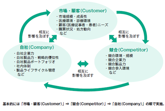 PEST分析と同様に、3C分析でも、まずは客観的なデータに基づいて整理することが前提になります。ただ、数字だけを追っていても見えてこない部分も少なくありません。既存データだけでなく、営業現場からの声や医師からのフィードバックなど、現場の生の情報も積極的に取り入れていくことも大切です。