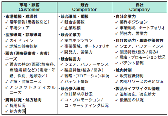 医療用医薬品のマーケティングにおいて、3C分析で検討すべき具体的な項目について、表2にまとめました。